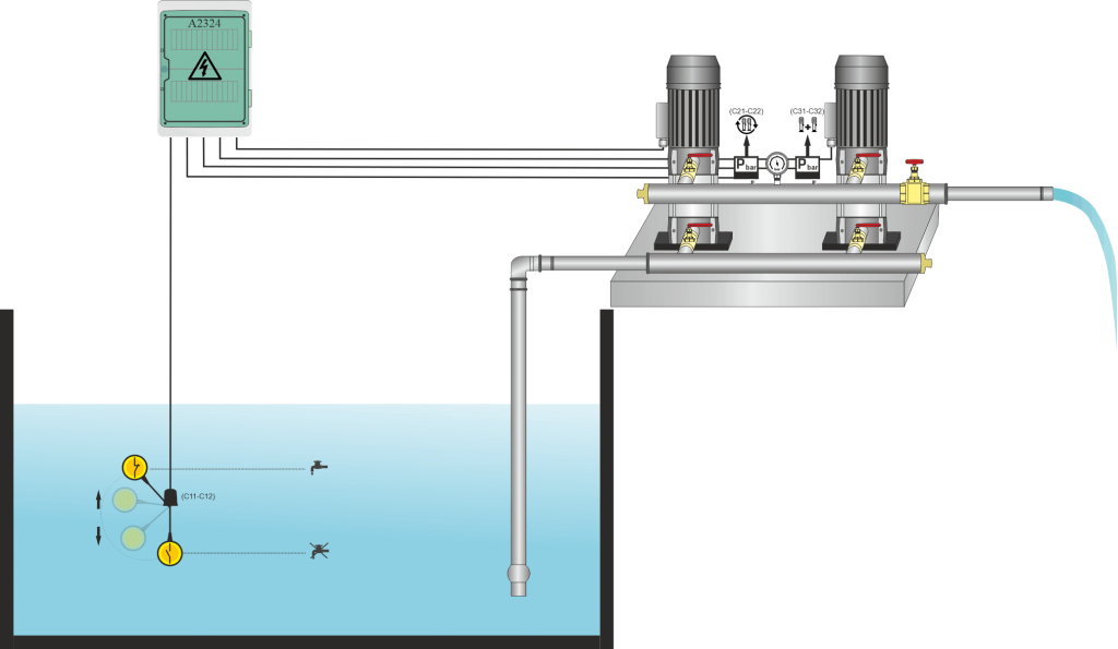 Comando e proteção de eletrobombas utilizadas em centrais hidropressoras ou águas residuais com 2 eletrobombas.