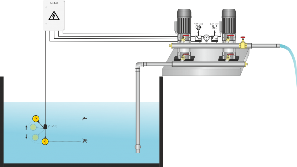 Command and protection of water pumps used in hydropneumatic stations and pumping systems with 2 pumps.