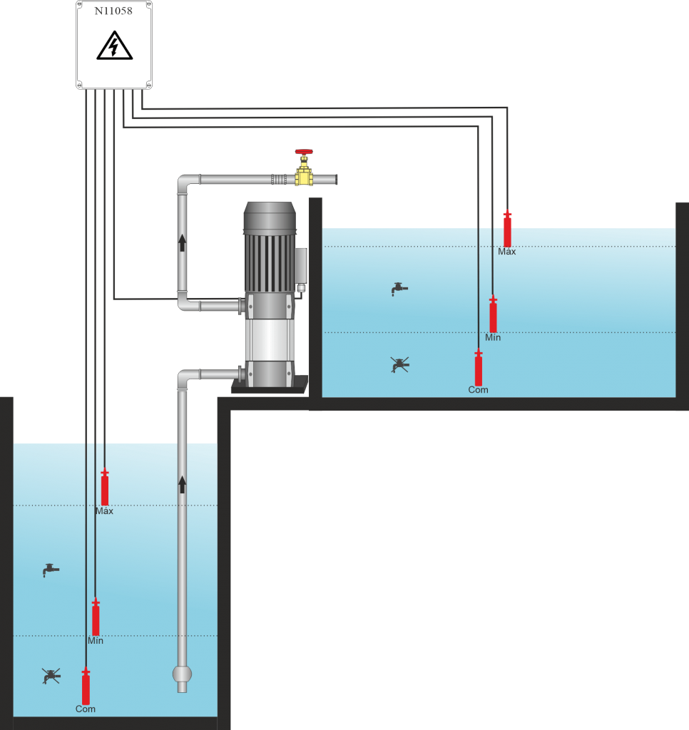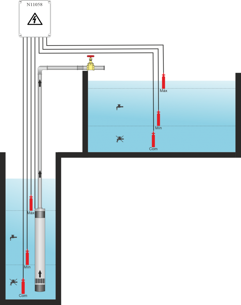 Control and protection of water pumps used in filling of deposits, through water extraction in wells, artesian holes or other reservoirs.